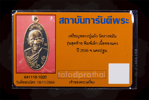 เหรียญใบขี้เหล็ก รุ่นสุดท้ายพิมพ์ใหญ่หลังยันต์สวน หลวงปู่แผ้ว วัดรางหมัน จ.นครปฐม ปี 2556